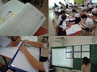 4年生が国語科の「走れ」の学習に取り組んでいました。グループで話し合いながら、場面の中にある登場人物のセリフを探し、それぞれの意見をホワイトボードに書き込んでいました。