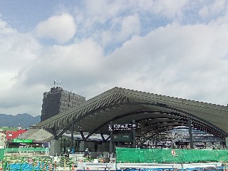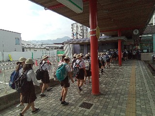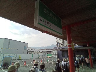 宮島口に着きました。雲は多めですが、まずまずのお天気です。今からフェリーに乗って、宮島に渡ります。
