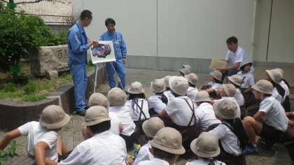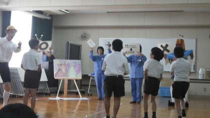 5月15日(月)に、4年生は環境事業局の方に出前授業に来ていただいて、ごみの学習をしました。初めに、劇等を交えたお話を聞いて、いよいよパッカー車体験です。