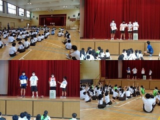 回を重ねるごとに、子どもたちはたてわり班活動に慣れてきています。今週の児童集会はは「わたしはだれでしょう」のゲームで楽しみました。舞台袖から聞こえる声の主は、4人のうち誰なのかを当てるゲームです。最後の問題は、先生を含めた4人でした。