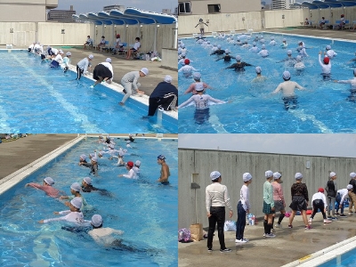4年生がプール水泳の時間に着衣泳を行いました。水着の上から普段着を着て入水し、動きにくさを体験したり、海や川に落ちたときの対処の仕方を考えたりしました。万が一のときに自身の命を守るための、とても大切な学習でした。