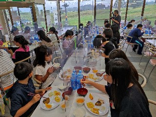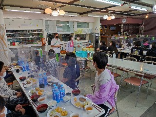 夕食の様子です。食堂は一人分のスペースがすべてパーテーションで区切られていました。