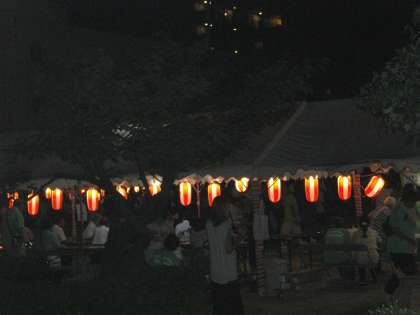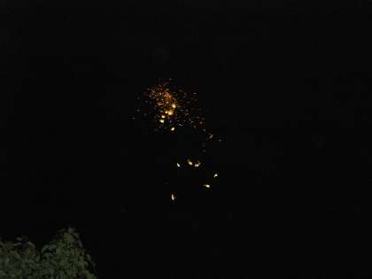 だんだんあたりは暗くなってきて、人も多くなり盛り上がりも最高です。午後7時30分、いよいよ花火の打ち上げです。これも花火担当の地域の方が安全に気を付けて、打ち上げてくださいました。みんな夜空を見上げてうっとり見つめていました。
