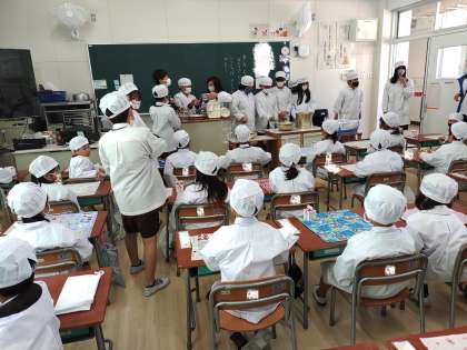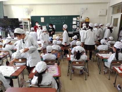 1年生は今日が初めての小学校での給食です。最上級生の6年生が給食を運ぶのを手伝ってくれました。