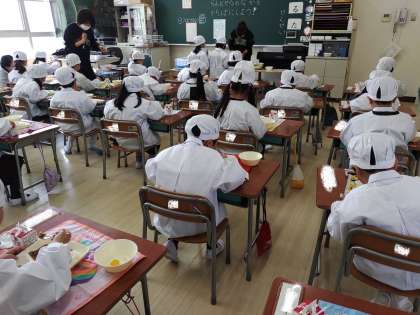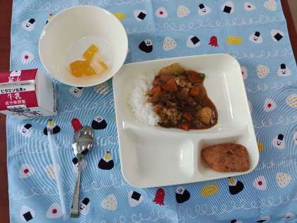 今日のメニューは「入学・進級お祝いメニュー」として今日はカツカレーとゼリーでした。「カレー大好きやねん。」「すごくおいしかった。」という声が1年生から聞かれました。