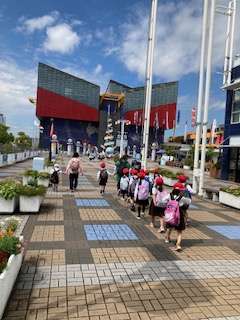お天気に恵まれて1.2年生の遠足で、海遊館に到着しました。