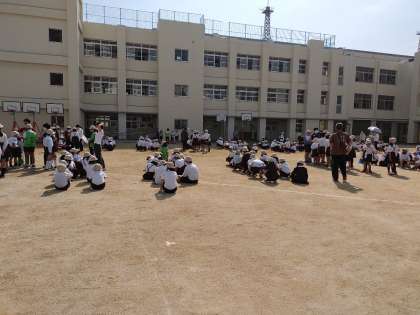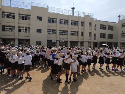 5月18日、今年度初めての児童集会を行いました。地区児童会のそれぞれの分団に分かれて、全校児童で運動場でジャンケン列車というゲームを楽しみました。