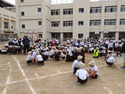 5月25日の児童集会は「お買い物に行こうよ」というゲームをしました。司会者が果物などの名前を言って、その字数と同じ人数の友だちとグループを作って座るというゲームです。何回かゲームを行っていくなかで、いろいろな友だちとグループをつくることができていました。