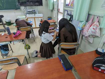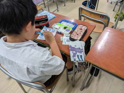 糸通しや玉結び、波縫いなど5年生になって始めて学習しています。難しいことがたくさんありますが、上手に縫い物ができるように、一人で、また友だちに教わったりして、練習しています。