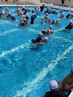 子どもたちが楽しみにしていたプール学習が始まりました。1年生は初めてのプールだったので、6年生に教えてもらいながら一緒に入りました。