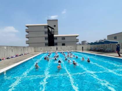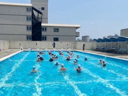 プールびよりのなか、プール学習が始まりました。水になれるために水中で曲に合わせて体を動かしました。