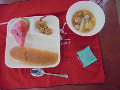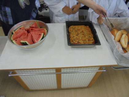 今日、7月11日の給食のデザートはスイカでした。パエリアとともに暑い夏の一日にぴったりの献立でした。