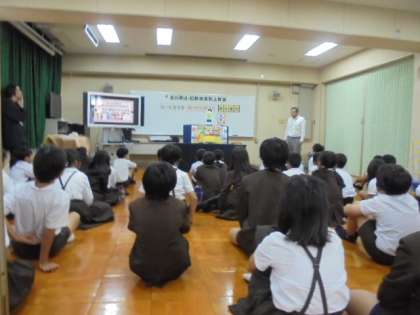 10月6日、5年生は非行防止教室を行いました。梅田少年サポートセンターより警察OBの2名の方に来ていただいて、万引き防止の人形劇やお話をしていただきました。