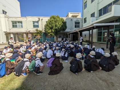 大池小学校6年生の代表児童のあいさつの後、いくのコーライブズパークの方に、いくのコーライブズパーク、コリアタウンについて教えていただきました。