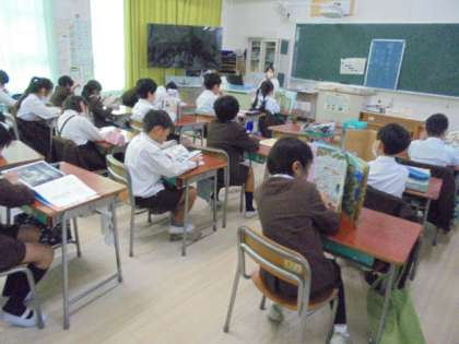 酉島小学校朝のでも朝の会を利用して、この一週間を読書週間として、みんなで読書をしています。