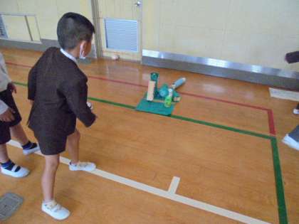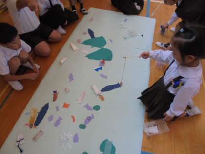 11月2日、2年1組が1年1組のみんなをおもちゃランドへ招待しました。2年生が、それぞれの班で考えた的あてやボーリング、釣りなどの遊びを、1年生にルールや遊び方などを伝え楽しみました。少し、2年生は少しお兄さん・お姉さんになったようでした。