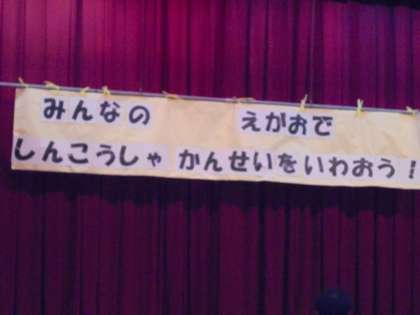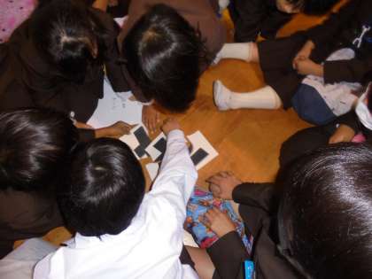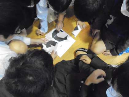 まず、集会委員からパズルを作るゲームをしました。縦割り班ごとに分かれてみんなで班のパズルを完成させ、そのあと舞台上に作ったパズルを班ごとに貼っていくと……今日のめあてを作り上げることができました。