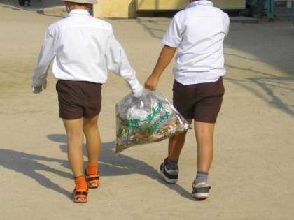 ごみがたくさんたまっていきます。学校へ持って帰りました。たくさんのごみが集まりました。子ども達は自分たちが住んでいる地域をきれいにして、お天気のように晴れやかな表情で戻ってきました。