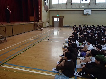 生活指導の先生のお話。「学校のきまりを守って、安心安全に楽しくすごしましょう。」