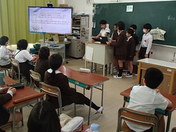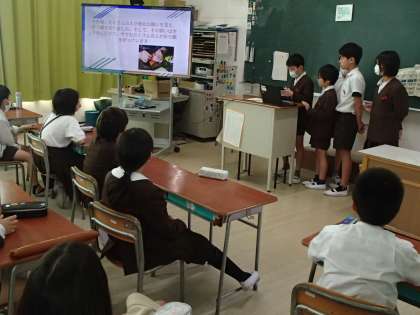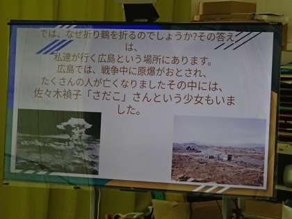 これは、修学旅行の取り組みの一つです。6年生はグループに分かれて、それぞれの教室に行きました。まず、折り鶴のもつ意味について、スライドで説明していました。