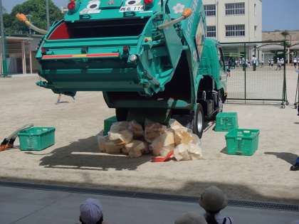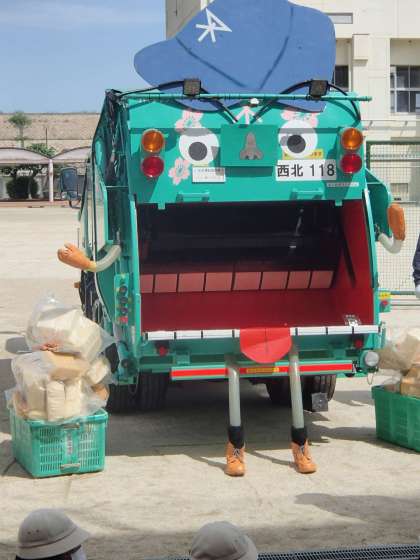 今日は、清掃局西淀工場からゲストティーチャーに来ていただいての、パッカー車体験の常行がありました。