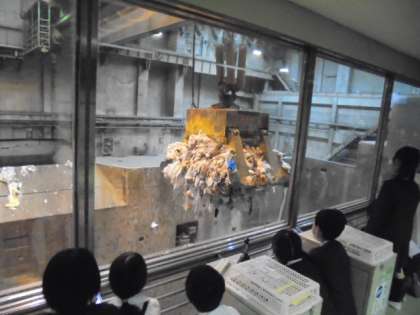 50mもの深さのあるごみピットに入れられたごみを大きなクレーンでつかんで、焼却炉に入れるようすを見ました。大きなクレーンでたくさんのごみを落とすようすを見て、子どもたちは歓声の声を上げていました。その後、子どもたちからはたくさんの質問が出ました。とても学びのある社会見学になりました。