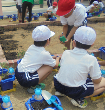 先日、サツマイモの苗を植えました。今日は、土を入れ替えて一人一人が自分の鉢にトマトの苗を植え付けました。植えた後は、綺麗に並べてお水をあげました。生活科で少しずつトマトの成長の観察していきます。おいしいトマトができるように、毎日お水やりをしてくださいね。