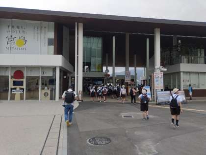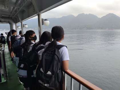 宮島口からフェリーに乗っています。フェリーが初めての児童もいるようです。