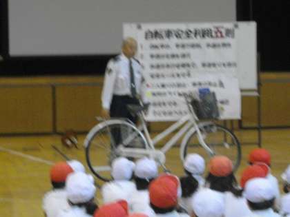 11月18日(水)は、本年度2回目の交通安全指導の日でした。今回は自転車の正しい乗り方ということで、実際に子ども達も自転車に乗る予定で、此花警察の方に講師をお願いしていました。しかし、あいにくの雨で運動場が使えず、講堂での指導になってしまいました。でも、自転車を使っての指導は、毎日の自転車の乗り方を振り返る良い機会になりました。