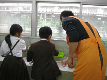 いよいよ実習です。慣れない手つきの子ども達を優しく手をとって教えてくださいました。とても上手にできるようになりました。お家でのお手伝いに役立てていることでしょう。