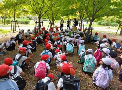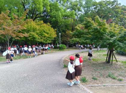 みんなで大阪城公園の「秋見つけ」をしました。葉は色とりどりに変化していましたが、ドングリはなかなか大きなものが見つからなかったようでした。