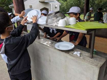 昼食が終わり、班で協力して片付けをしています。