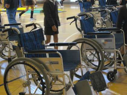 12月17日(木)に、4年生は車いす体験をしました。リハビリテーションセンターの方に来ていただきました。車いすも練習用のコースもすべてセンターの方が用意していただきました。