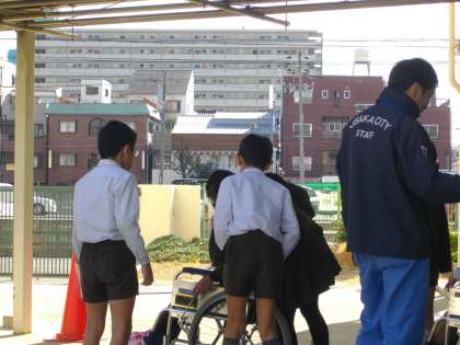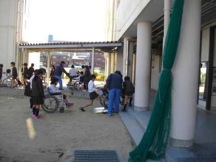 講堂で練習した後は、グループで廊下や運動場で車いすを動かしました。押している時の段差の不自由さがわかりました。また押してもらっている方も、がたがたする道や段差は怖いことも体験しました。