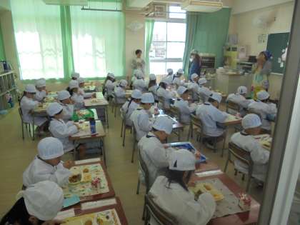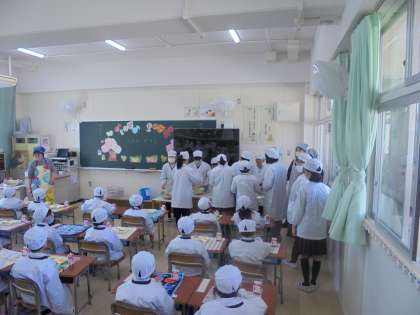 6年生のお兄さん、お姉さんに給食の用意を手伝ってもらいました。