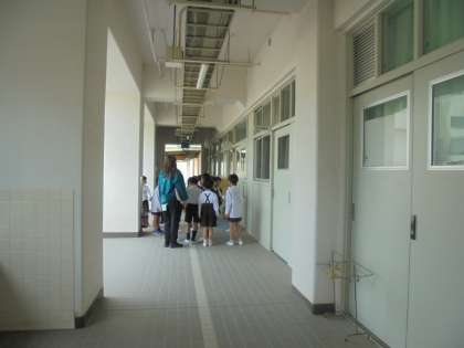 2年生のおにいさん、おねえさんが1年生を手をつないで学校をたんけんしながら、やさしく一つ一つの教室について説明していました。