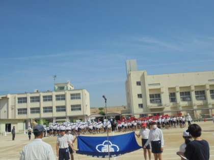 とても暑い日でしたが、校旗、プラカード係を先頭に元気に腕をふって行進練習できていました。