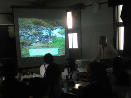 まず、世界各地の有名な地形や、川の流れを見ました。先生の詳しい説明に聞き入っていました。次に、地層のでき方を簡単ですが、よくわかる実験で確かめました。運動場の土を使ったので、子ども達は興味深く見ていました。2時間目は外に出て、こんもり土が積もっている花壇に川の道をつくり、水を流して流れる様子や流れた後の様子を、実験観察しました。写真で見たような現象も見ることができて、子ども達はいきいきと観察していました。最後に、最近起こった土砂災害の映像を見ました。川の恩恵を知るとともに、自然の恐ろしさもよくわかったようです。