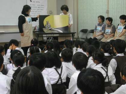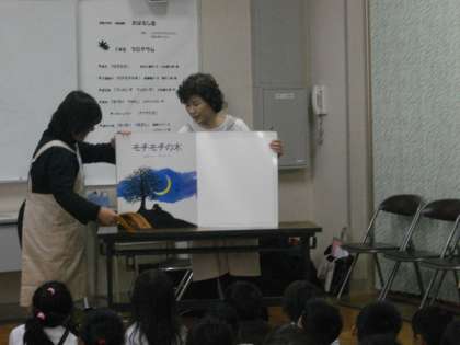 10月22日(火)に、1.2年生は「おはなしたまご」という読み聞かせのグループの方に来ていただいて、お話会をしました。毎年、夏休みと2学期の読書週間に来ていただいていますので、子ども達は楽しみに待っていました。今年は大型の絵本や、パネルシアターもしていただいて、とても盛り上がりました。