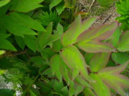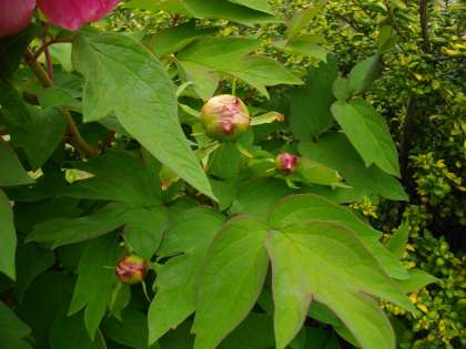シャクヤクです。つぼみもたくさんつけています。太陽の光をいっぱい浴びて、大きく開いています。