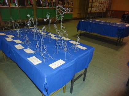 絵は「みんなもピカソ」です。ピカソになった気分でピカソの絵を模写しました。工作は「ワイヤーアートで夢の塔」です。ワイヤーを切ったり曲げたり、つなげたりして夢の塔をつくりました。