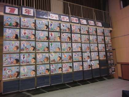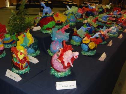 絵は「シャボン玉にのって」です。シャボン玉の中に入って、とんでいきたい気持ちでかきました。工作は「きょうりゅうのあかちゃんがうまれたよ」です。風船に紙を貼ってはりこのたまごを作り、紙パックとスプーンできょうりゅうのあかちゃんを作りました。