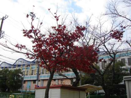 冷たい北風が吹いています。本校は淀川の横にあるので、川風がとても強いです。雨や風で、きれいな赤に紅葉していた桜の葉っぱはほとんど散ってしまいました。がんばってぶら下がっている葉もありますが・・・。もみじの木はあまりありませんが、今紅葉の真っ盛りです。1年生が生活科の学習で、落ち葉を集めていろいろなものを作っていました。もう、落ち葉も本校では、終わりに近づきつつあるようです