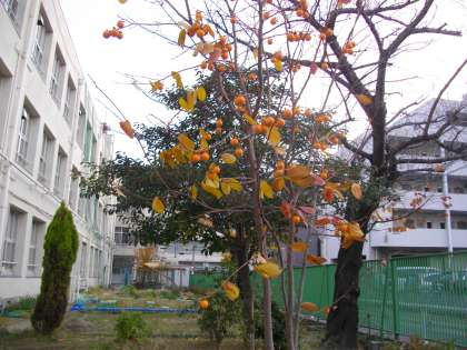 この柿は、学習園をお世話してくださっている地域の方が植えられたそうですが、毎年たくさんの小さな柿の実が実ります。でも、大変な渋柿です。気を付けるように言われていましたが、一度確かめようとして一口食べてみましたら、本当に口の中が痛くなるほどの渋さでした。干し柿にしてみた職員がいましたが、少しは渋さは和らいでいたそうです。見るだけでもかわいい柿です。