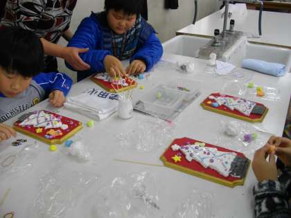 飾りの段階になると、大人も「子どもの発想はすごいね」と感嘆するほど、色粘土を組みあわせたり、かわいい飾りに仕上げたり、みんな違う素敵な壁掛けが出来上がりました。今年のクリスマスに、一つ手作りの飾りが増えました。参加した子どもも満足そうに大切に持って帰っていました。