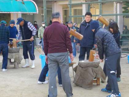 1月11日(土)に学校で、地域主催の「もちつき大会」がありました。各町会ごとのもちつきは、年末にしているところが多いのですが、酉島の10町会連合のもちつきは、昨年から始まりました。