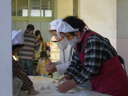 つきはじめや、ある程度まとまるまでは大人がつきました。つきたい子どもはついていましたが、重そうでした。つきあがったおもちを手早く丸めていくのは、地域の方です。きなこもちとあんもちを作られました。