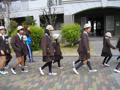 4時間目は避難訓練をしました。一昨年から津波対応の避難訓練を阪神淡路大震災の起こったこの時期にしています。一昨年は第2次避難場所を校舎の3階に想定して実施しました。しかし、校舎の3階が隣の淀川の堤防と同じ高さの立地ですので、昨年は堤防に立っている「なぎさ街」という集合住宅の広場を第2次避難場所にして訓練を実施しました。今年は、第3次避難場所になる、各棟の階上へ上がる入口を確認するところまでをしました。