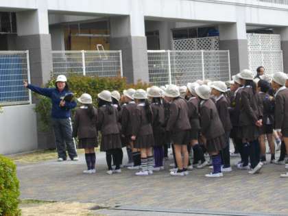 第2次避難場所に避難し、全員避難できたことを確認しました。そして、さらに高い津波がくるという警報が発令されたという想定で、第3次避難場所へ移動しました。今回は入口の確認まででしたので、場所を確かめました。「高いところ、高いところへ逃げる」ということは、1時間目のDVDや宇井先生のお話の中で何度も出てきた言葉なので、目の前の建物の高さを見て、その意味が分かったようでした。