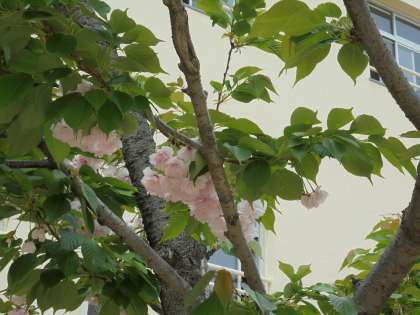 職員室の前には八重桜があります。今、きれいな花をつけています。